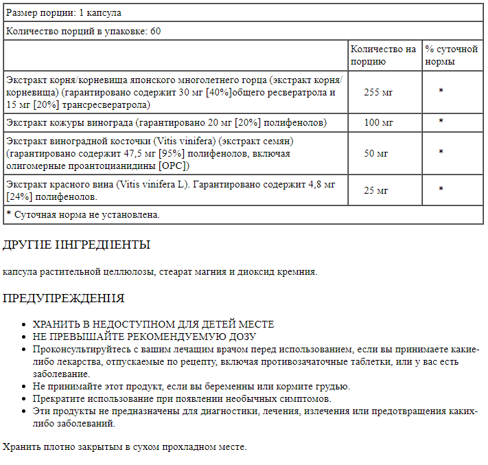 Ресвератрол японского горца Solaray 75 мг содержит экстракты красного вина и винограда, чтобы обеспечить сильную дозу ресвератрола. Было показано, что ресвератрол обеспечивает значительные антиоксидантные свойства в организме, особенно в отношении сердца. Антиоксиданты помогают бороться со свободными радикалами, которые могут повредить клетки организма и вызвать заболевание.