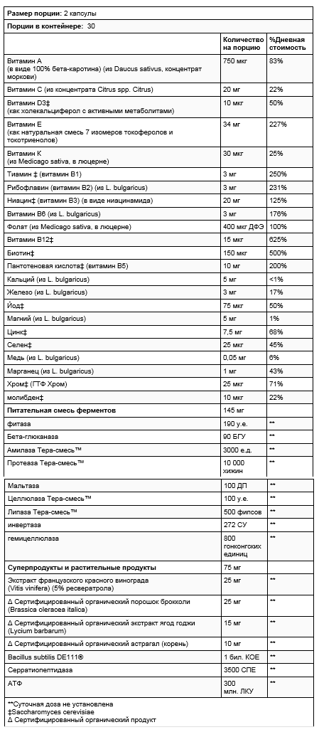 Enzyme Nutrition™ Two Daily содержит Enzyme-Activated Nutrients™ как часть цельной пищевой матрицы и является жизнеспособным вариантом для каждого члена семьи в возрасте 14 лет и старше. Каждый ингредиент выращивается для сохранения максимальной эффективности ферментов в структуре пищи. Дополнительные ферменты Thera-blend™ улучшают усвоение витаминов, минералов, суперпродуктов и растительных компонентов. Усовершенствованная смесь максимизирует способность увеличивать энергию и поддерживать иммунную функцию, одновременно обеспечивая ежедневную антиоксидантную поддержку.