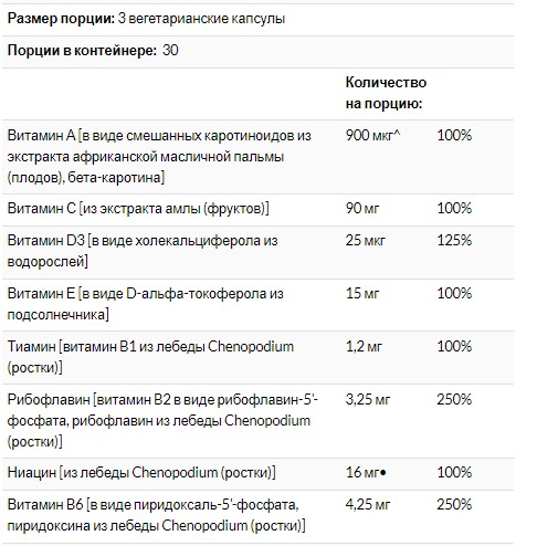 ^ Эквивалент активности ретинола (RAE). º Пищевой фолатный эквивалент (DFE). • Ниациновый эквивалент (NE).