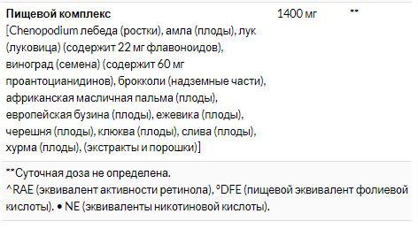 Экстракты и порошки из ростков киноа (Chenopodium quinoa), плодов амлы, луковиц лука (содержат 22 мг флавоноидов), косточек винограда (содержат 60 мг проантоцианидинов), надземных частей брокколи, плодов африканской масличной пальмы, плодов бузины черной, плодов ежевики, плодов черешни, плодов клюквы, плодов сливы, плодов хурмы.