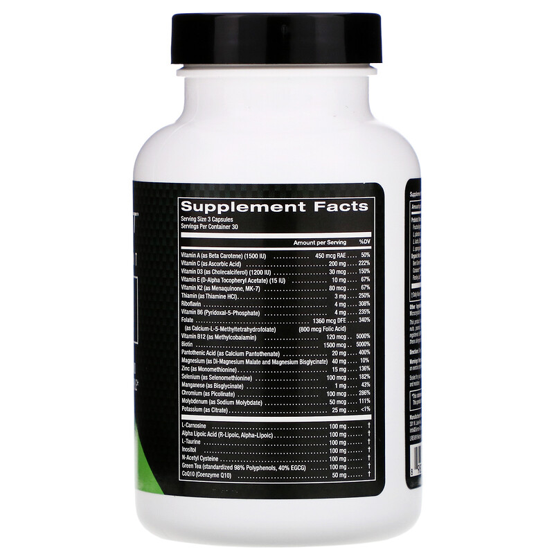 Витамин A, витамин C, витамин D3, витамин E, витамин K2, тиамин, рибофлавин, витамин B6, фолат, витамин B12, биотин, пантотеновая кислота, магний, цинк, селен, марганец, хром, молибден, калий
