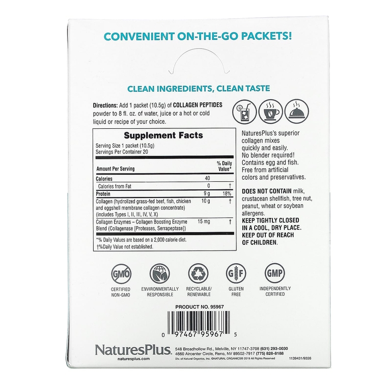 Для лучшего самочувствия и внешнего вида используйте NaturesPlus с пептидами коллагена. Укрепите здоровье волос, кожи, ногтей, суставов, иммунной системы и многих других систем организма с помощью пептидов протеина коллагена.
