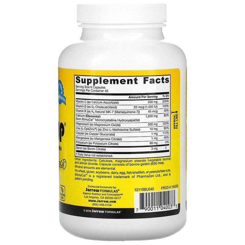 Клинически доказано, что он не вызывает непропорционально повышенного уровня кальция в крови в отличие от других форм кальция (например, солевых форм карбоната и цитрата). StimuCal™ в сочетании с витаминами D3 и K2 (в виде MK-7, полученного в результате натуральной ферментации [более биодоступная форма витамина K]) способствует правильному депонированию кальция в костях, а также формированию костного матрикса. Bone-Up также поддерживает здоровье сердечно-сосудистой системы и артерий. Цитрат калия представляет собой системный подщелачивающий агент, добавляемый для оптимальной поддержки костной системы.