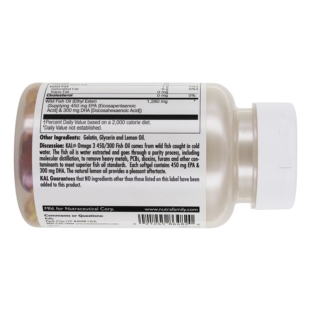 Рыбий жир KAL Омега-3 получают из холодноводной рыбы. Он проходит многоступенчатый процесс очистки, включая молекулярную дистилляцию, для удаления тяжелых металлов, ПХД, диоксинов, фурана и других загрязняющих веществ. Каждая капсула содержит 450 мг ЭПК и 300 мг ДГК.