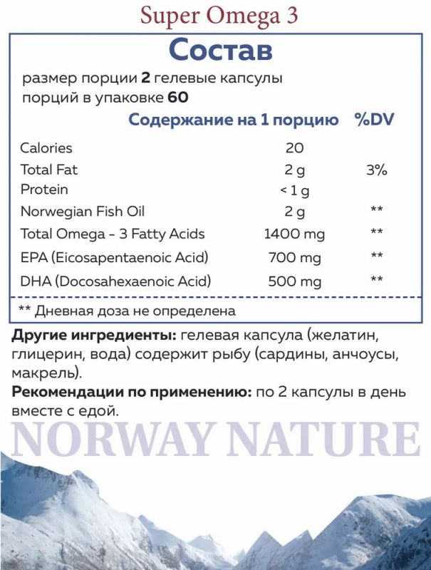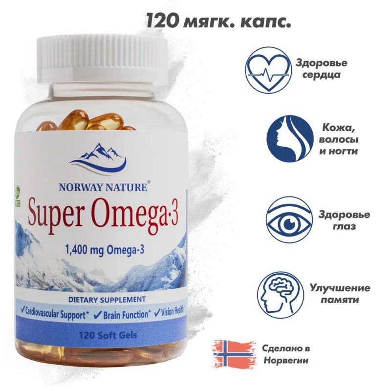 Norway Nature Super Omega-3 с высоким содержанием ПНЖК 350 EPA и 250 DHA в 1 капсуле. Концентрат натурального рыбьего жира в гелевой капсуле, компоненты EPA и DHA улучшают работу сердца, мозга и зрения, благотворно влияют на весь организм. Высококачественное сырье глубоководных рыб добывается традиционными, экологически безопасными методами лова. Производится в соответствии со стандартами строгого контроля качества.