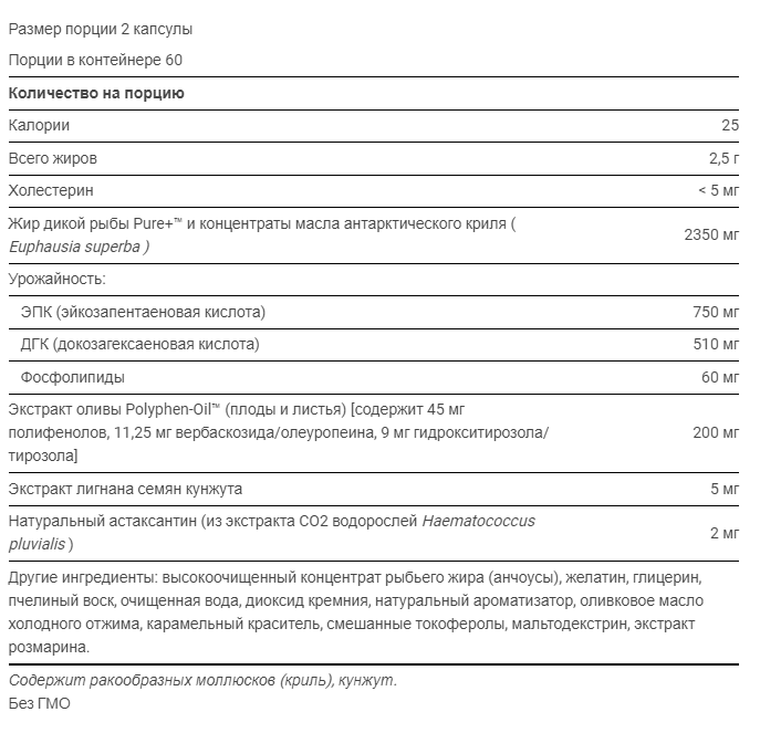 Концентрат рыбьего жира с высокой степенью рафинирования (анчоус), желатин, глицерин, пчелиный воск, очищенная вода, диоксид кремния, натуральный ароматизатор, оливковое масло холодного отжима, карамель (краситель), смешанные токоферолы, мальтодекстрин, экстракт розмарина.