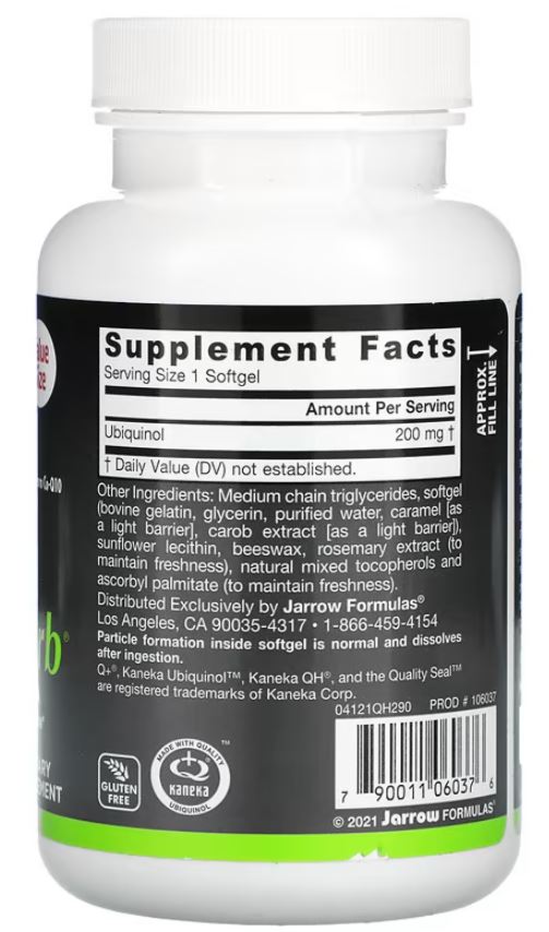 Коэнзим Q10 содержится в тканях, вырабатывающих большое количество энергии, таких как ткани сердца, и поддерживает здоровье митохондрий, выработку энергии, способствуя нормальной работе сердечно-сосудистой системы. Убихинол — восстановленная, активная форма коэнзима Q10 с антиоксидантами, усваивается значительно лучше, чем обычный коэнзим Q10. Клинически доказано, что запатентованная формула QH-abs от Jarrow Formulas повышает уровень коэнзима Q10 на 222% (100 мг в день) и на 777% (300 мг в день) по сравнению с исходным уровнем.
