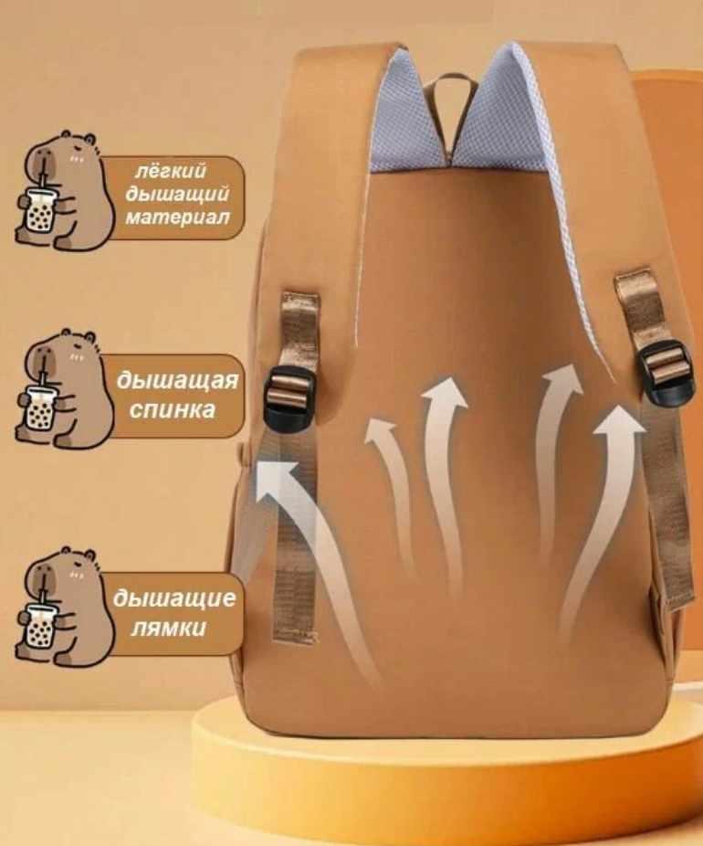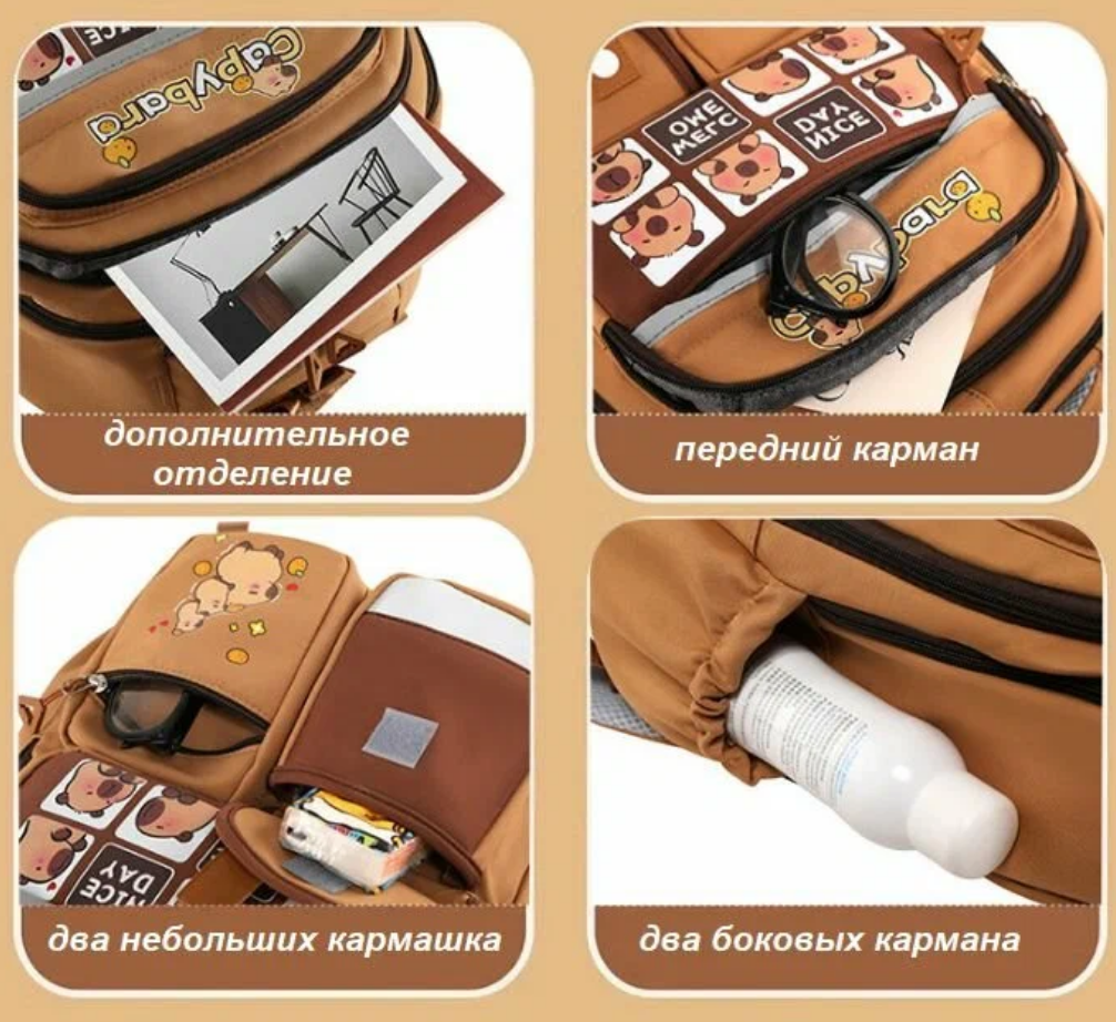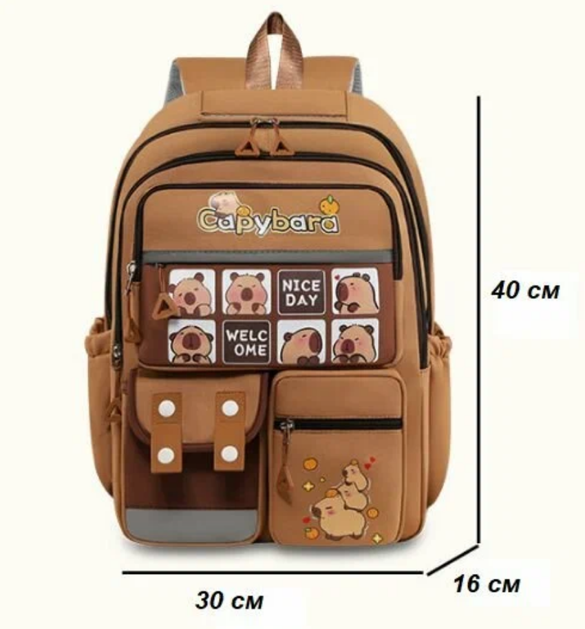 Школьный городской рюкзак капибара с ярким и модным дизайном станет стильным аксессуаром для девочки или мальчика. Основной цвет школьного ранца – коричневый, что делает его универсальным и практичным. Лицевая часть украшена изображением самой милой водосвинки - капибары, добавляющими милый акцент в духе y2k. Спортивный рюкзак для подростка выполнен из качественного материала с гладкой матовой текстурой, устойчивого к загрязнениям, механическим повреждениям и брызгам воды. Передняя часть дополнена множеством карманов разного размера: два на молнии для мелочей, один с клапаном на липучке, что позволяет удобно организовать пространство для школьных принадлежностей или личных вещей. Боковые части оснащены сетчатыми кармашками, подходящими для бутылки воды или зонта. Анатомическая спинка с мягкими вставками обеспечивает правильное распределение нагрузки. Широкие регулируемые лямки позволяют настроить повседневный рюкзак под рост ребенка. Светоотражающие элементы гарантируют безопасность в темное время суток.