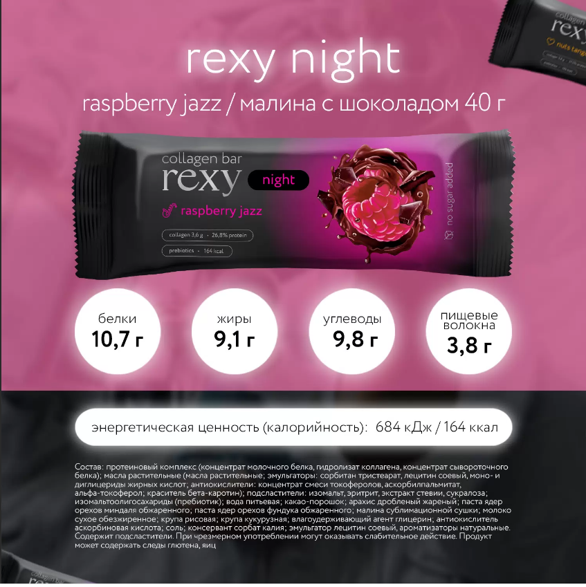 Посвяти этот вечер себе и не беспокойся о составе любимого десерта. О тебе позаботится фитнес-батончик rexy night — в нем: