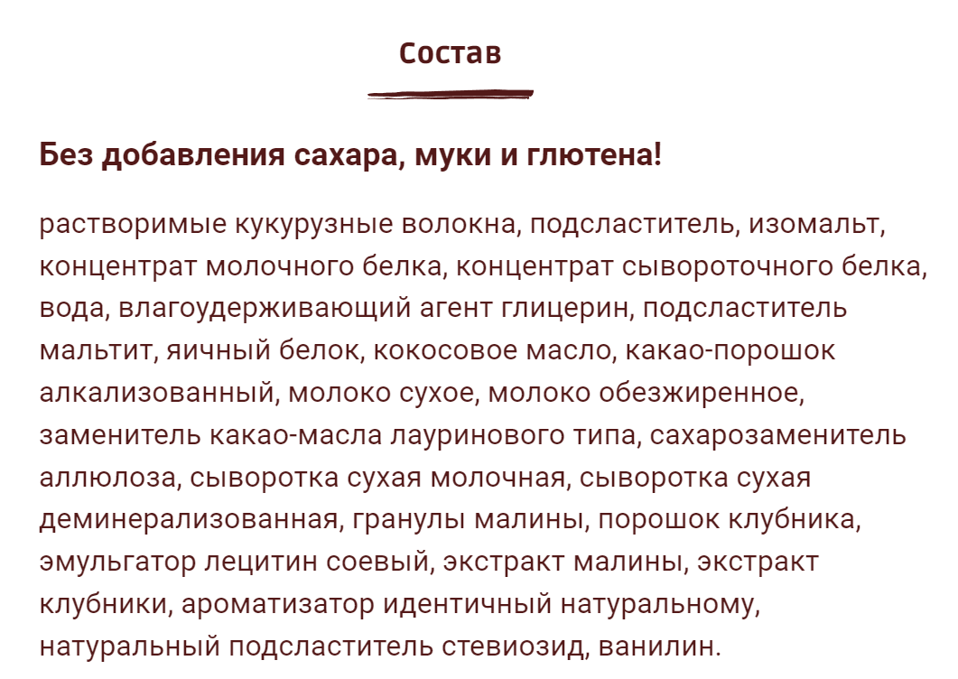 растворимые кукурузные волокна, подсластитель изомальт, концентрат молочного белка, концентрат сывороточного белка, вода подготовленная, влагоудерживающий агент глицерин, яичный белок, кокосовое масло, какао-порошок алкализованный, какао-порошок, сухое молоко, аллюлоза, фундук обжаренный, сыворотка сухая молочная, разрыхлитель, сыворотка сухая деминерализовонная, эмульгатор лецитин соевый, ароматизатор идентичный натуральному, натуральный подсластитель стевиозид, подсластитель сукралоза, ванилин.
