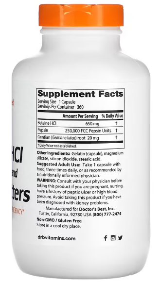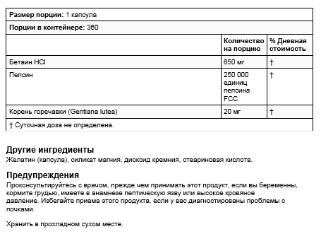 Betaine HCl/Pepsin/Gentian Bitters содержит три питательных фактора, которые выполняют взаимодополняющие функции, предназначенные для поддержки эффективности процесса пищеварения. Добавки с бетаином HCl могут поддерживать пищеварительную способность желудка. Пепсин — это фермент, вырабатываемый организмом для переваривания белковосодержащих продуктов в желудке. Пепсин работает в сочетании с желудочной кислотой для поддержки переваривания белков. Горечавка — это трава, используемая для повышения пищеварительной способности и тонизирования пищеварительного тракта. Его горький характер может помочь стимулировать выработку организмом пищеварительных ферментов.