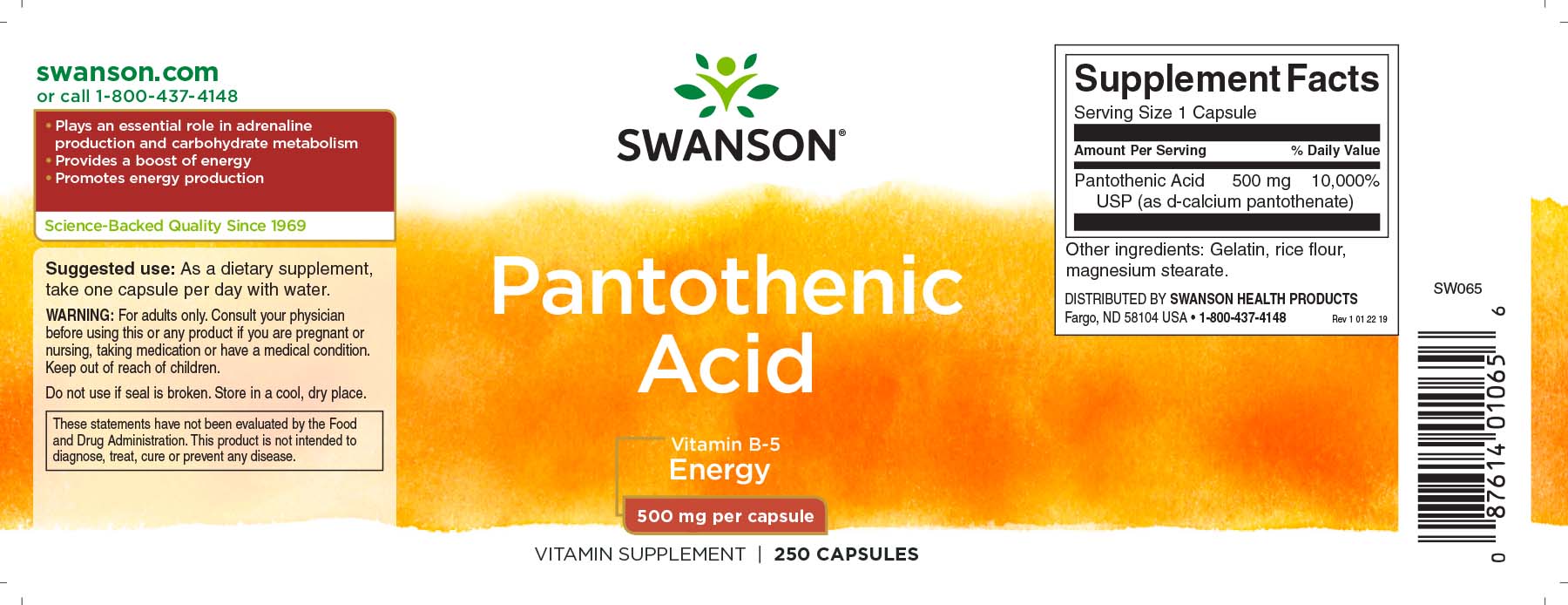 Пантотеновая кислота, или витамин B-5, играет жизненно важную роль в жировом и углеводном обмене, а также в выработке адреналина. Этот уникальный витамин также помогает снабжать организм энергией, что делает его фаворитом среди спортсменов. Каждая капсула содержит 500 мг пантотеновой кислоты.
