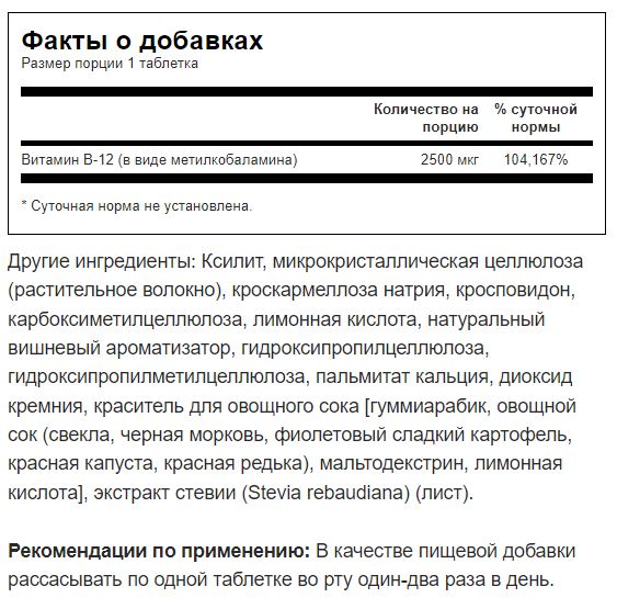 Swanson теперь предлагает неврологически активную форму витамина B-12 в таблетках с меньшей эффективностью, идеально подходящую для всех, кому требуются меньшие суточные дозы. Обычные добавки B-12 содержат цианокобаламин – форму, которую ваш организм должен преобразовать в метилкобаламин, который является веществом, поддерживающим здоровье вашей нервной системы. Наш метилкобаламин с высокой абсорбцией витамина B-12 дает вам легко трансформируемое конечное вещество для немедленного использования вашим организмом.
