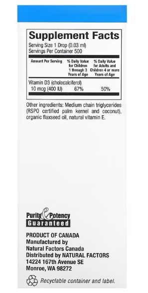 Витамин D3 необходим для крепких костей и зубов, поскольку он увеличивает усвоение организмом кальция из пищи. Его роль в регулировании уровня кальция также помогает регулировать иммунную систему и поддерживать здоровье нервов и мышц. Витамин D3 — это мощная жидкая добавка, тщательно смешанная со смесью триглицеридов со средней длиной цепи (полученных из сертифицированных экологически чистых пальмоядрового и кокосового масел) и льняного масла, обеспечивающая 10 мкг (400 МЕ) витамина D3 всего в одной маленькой капле.