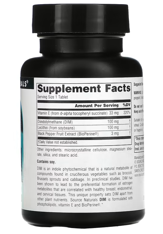 DIM — это фитохимический индол, который является естественным метаболитом соединений, содержащихся в крестоцветных овощах, таких как брокколи, брюссельская капуста и белокочанная капуста. В доклинических исследованиях было показано, что ДИМ приводит к предпочтительному образованию метаболитов эстрогена, которые коррелируют со здоровыми тканями молочной железы, эндометрия и шейки матки. Это уникальное свойство отличает DIM от других питательных веществ для растений. Source Naturals DIM содержит фосфолипиды, витамин Е и BioPerine®.