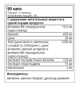 Минерально-Витаминный Комплекс ZMA Sleep Max от Maxler – это уже привычный комплекс ZMA (цинк, магний, витамин В6), в который также добавлены экстракты гинкго билоба и пассифлоры. Нормализует выработку белка, давая организму возможность строить мышцы, а также улучшает состояние нервной системы, репродуктивной, состава крови, повышает иммунитет. Улучшает кровообращение и дарит здоровый сон для восстановления.